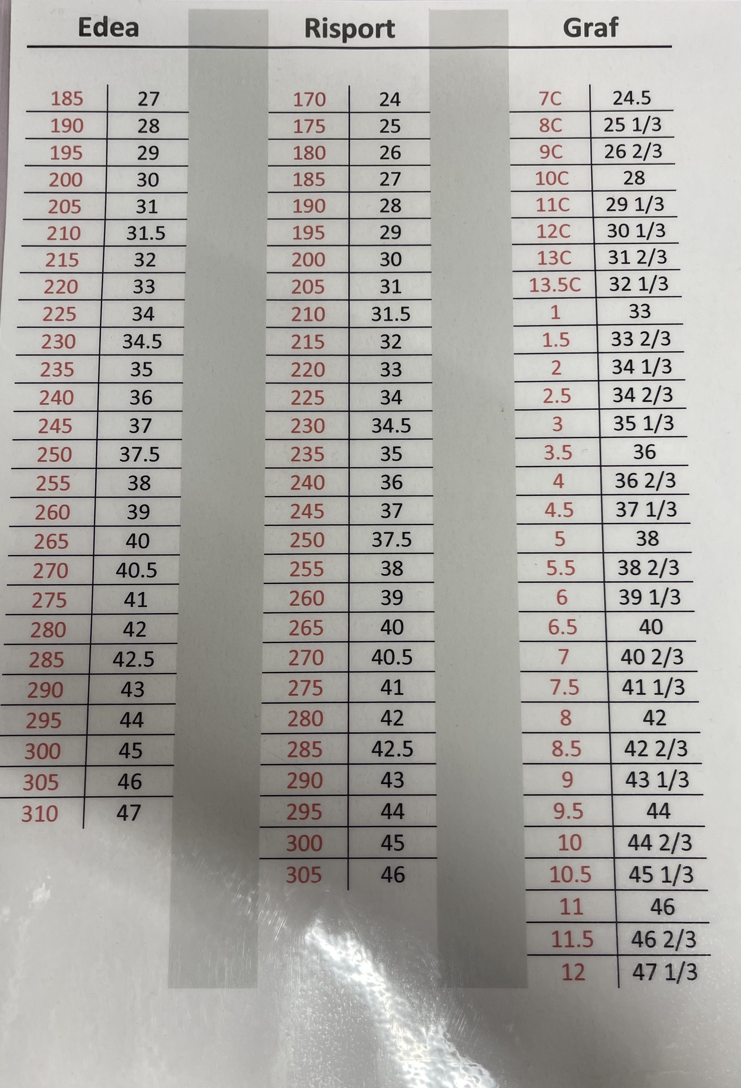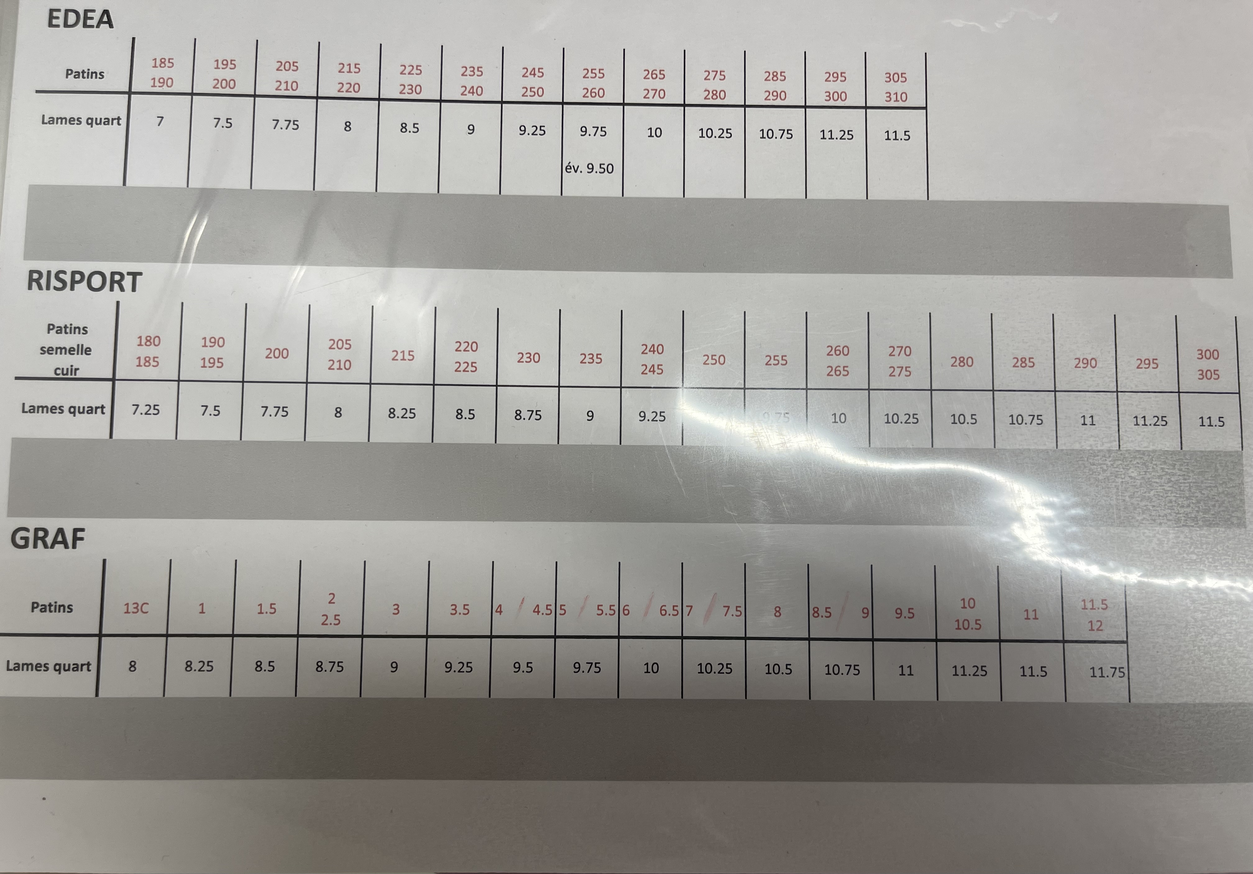 Correspondance des pointures pour les patins